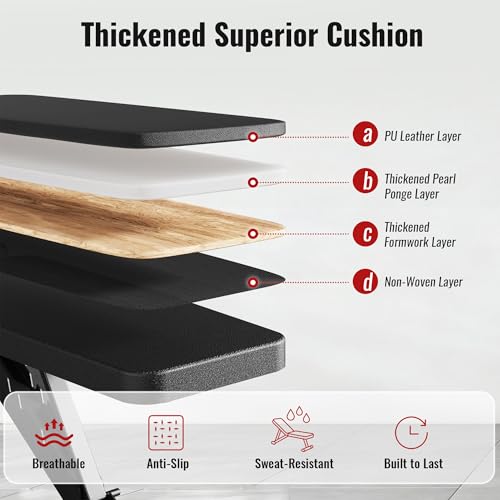 DURABLE THICKENED WORKOUT BENCH CUSHION: Thickened cushion of the exercise bench is covered with premium leather, which is sweat-resistant, anti-slip, breathable and and simple to wipe clean.The supportive cushion ensures comfort and stability across all your workouts