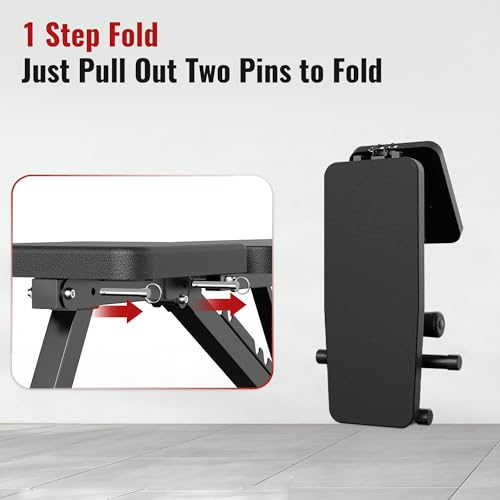FOLDABLE WEIGHT BENCH, SPACE SAVING: Simply pull two pins and this folding workout bench folds effortlessly. It compacts to 16.7″L x 7.8″W x 29.5″H, saving 80% storage space. Lightweight and easy to move, it’s the ideal weight bench for home gym where space is limited