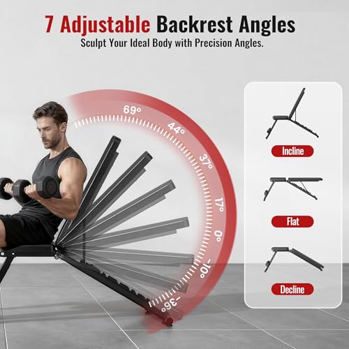 ADJUSTABLE WEIGHT BENCH FOR HOME GYM: Features 7 backrest adjustments to accurately target your chest, shoulders, back, and core. This sturdy adjustable bench is perfect for strength training, allowing you to perform incline, flat, and decline movements with ease