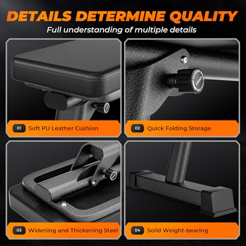 【Foldable and Compact Design】Designed to fit in your home without taking up much space, the flat bench can be easily folded and stored under beds or in closets. Perfect for any small home gym space.