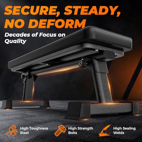 【Semi-Commercial Quality】Built from top-grade steel with uniquely designed 4-way frame structure, The flat bench can bear up to 1000 pounds. Each foot is covered with an anti-slip rubber boot to make sure your bench doesn’t move and wobble while you do.