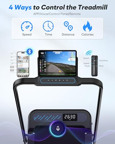 【2 In 1 Foldable Treadmill】The upgraded treadmill offers two modes to fit your lifestyle: Running Mode (0.6–6.2 MPH) for an intense workout, and Walking Mode (0.6–3.8 MPH) for light exercise while working. The portable treadmill is perfect for use under your desk, while the remote control with one-touch mute makes speed adjustments effortless. A built-in phone/tablet holder lets you watch movies or join work calls as you walk, keeping workouts productive and enjoyable.
