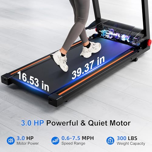 Multi-Functional Treadmills for Home with Device Holder & Incline: Stay entertained and focused with the built-in tablet/phone holder. This walking pad treadmill features a 5% manual incline and a 3.0 HP motor, supporting walking (0.6–4 MPH), jogging (4–6 MPH), and running up to 7.5 MPH. With a 300 lb weight capacity, this walking pad with handle bar is designed for shared use in any home.